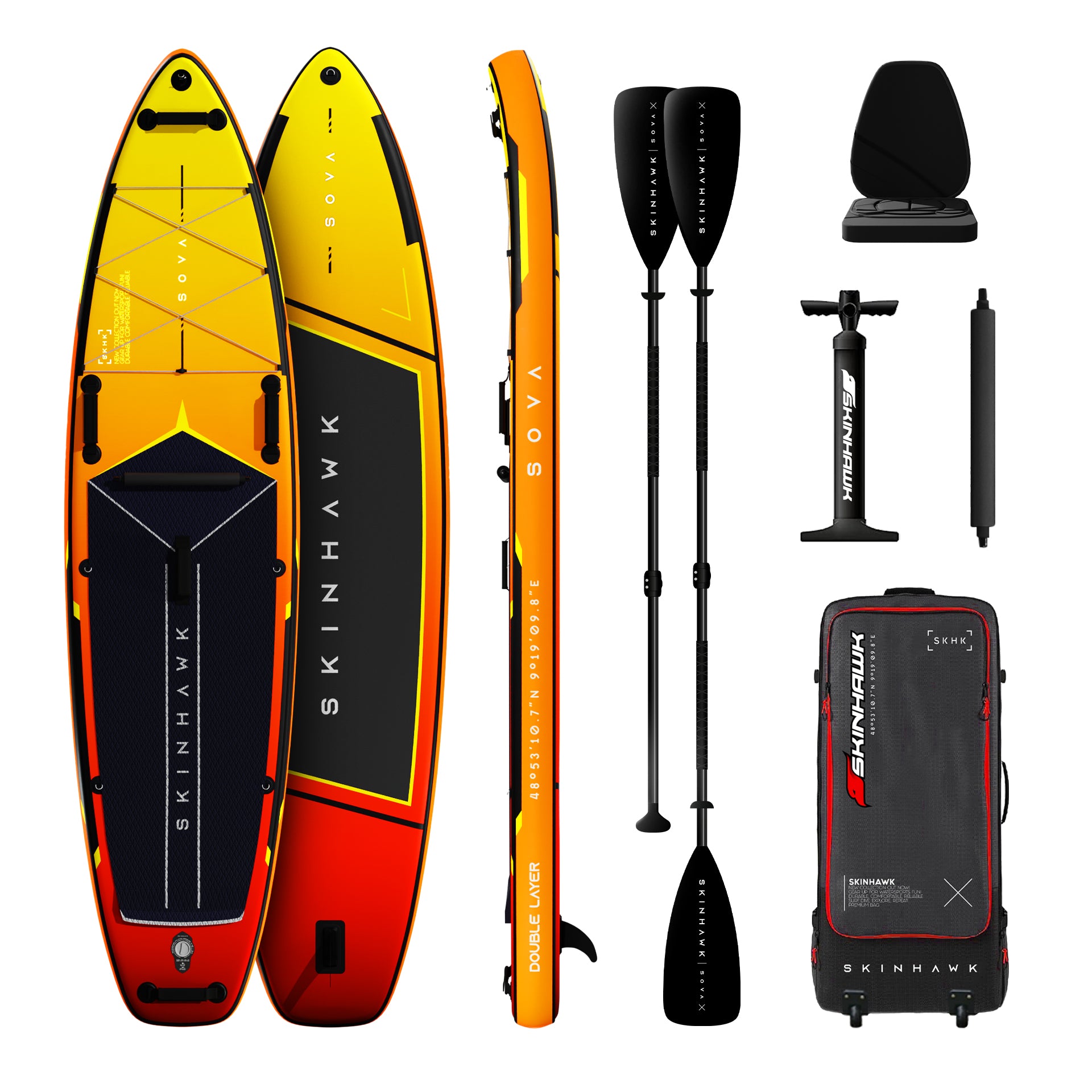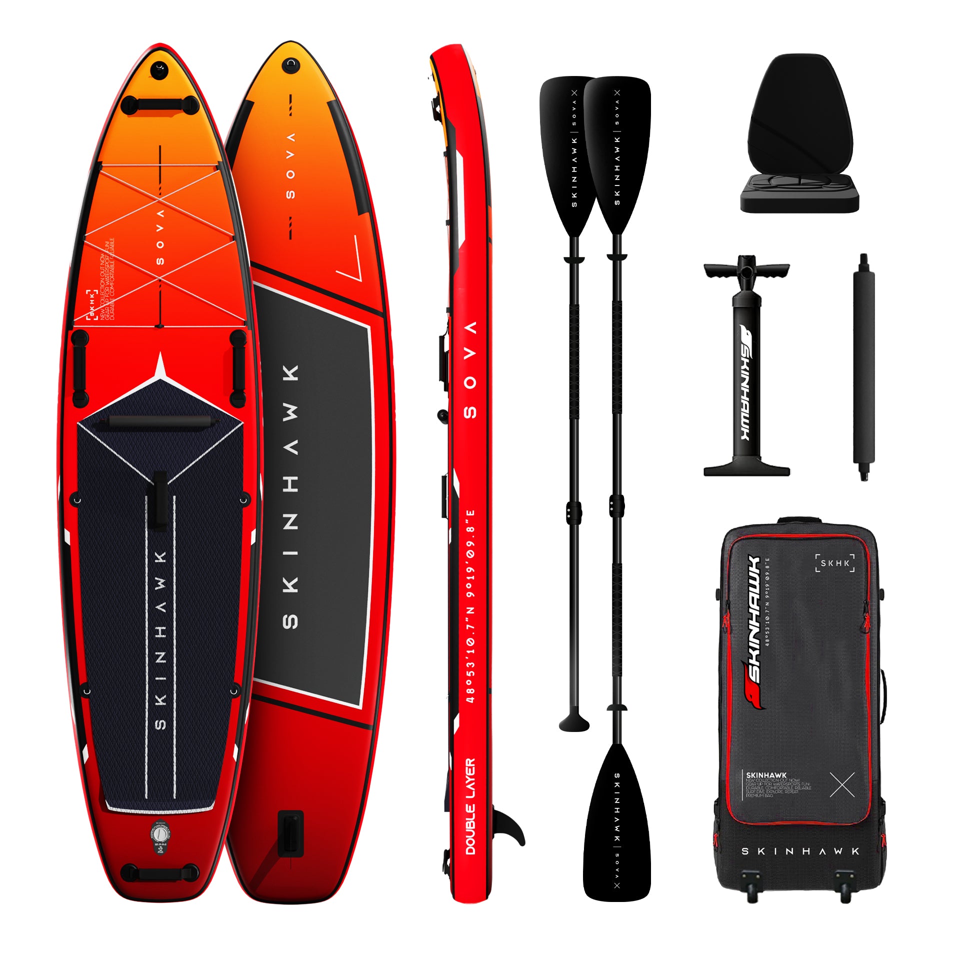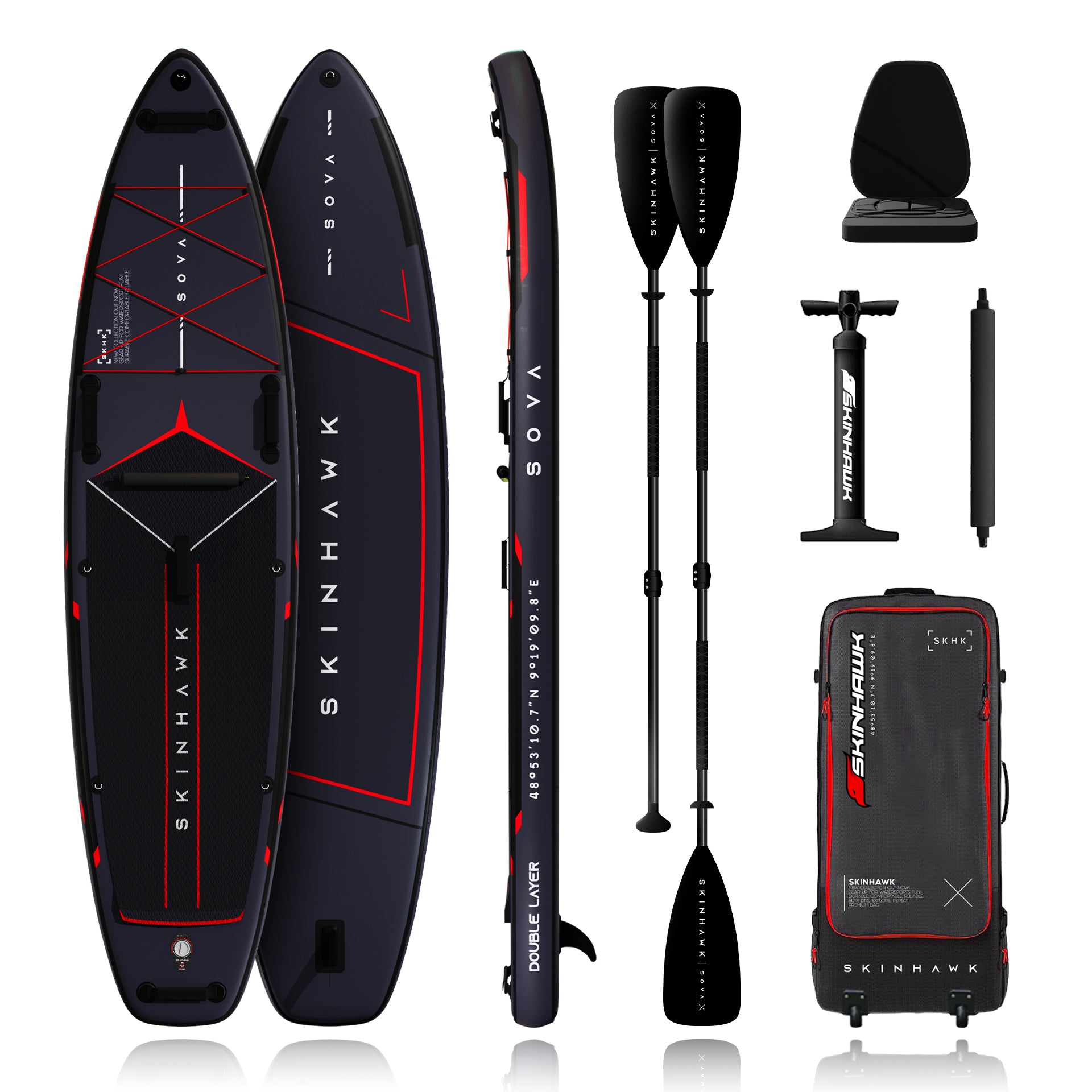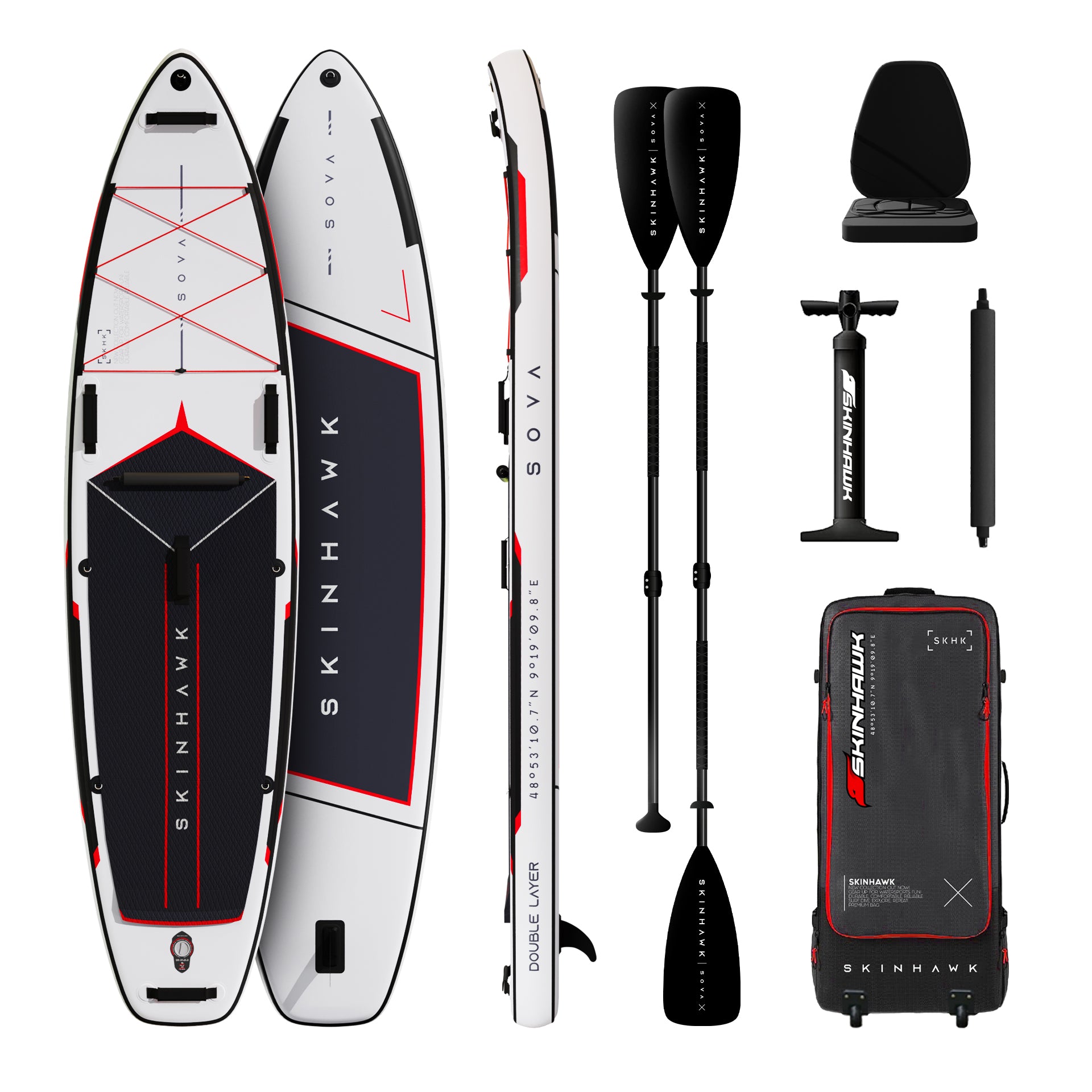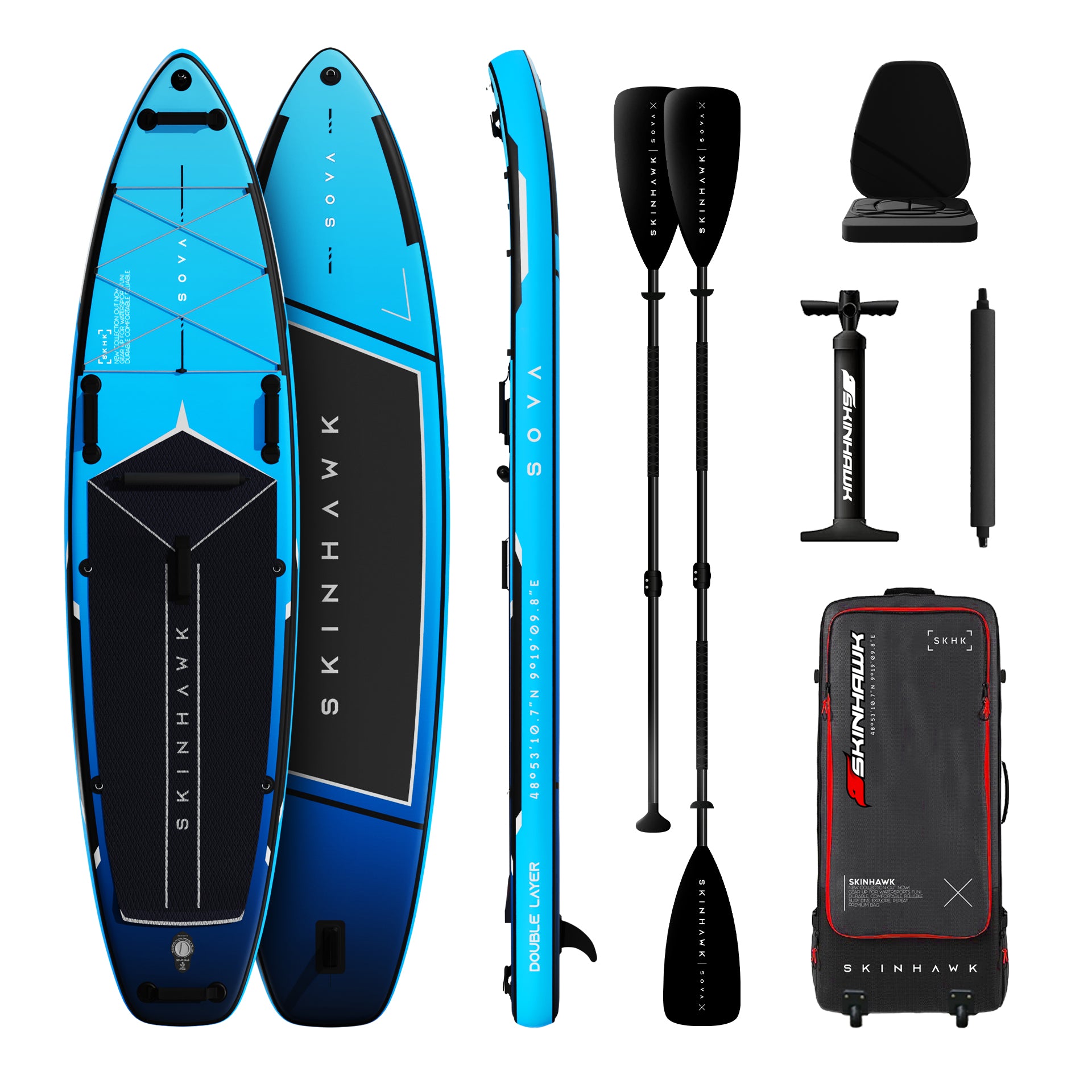 Das SOVA SUP von SKINHAWK überzeugt durch eine hochwertige Double-Layer-Bauweise mit MULTILAYER-Lamination, die für eine hohe Steifigkeit bei 9 PSI sorgt. Dadurch liegt das Board stabil im Wasser und vermittelt ein sicheres Fahrgefühl – ideal für entspannte Touren auf Seen oder ruhigem Gewässer.